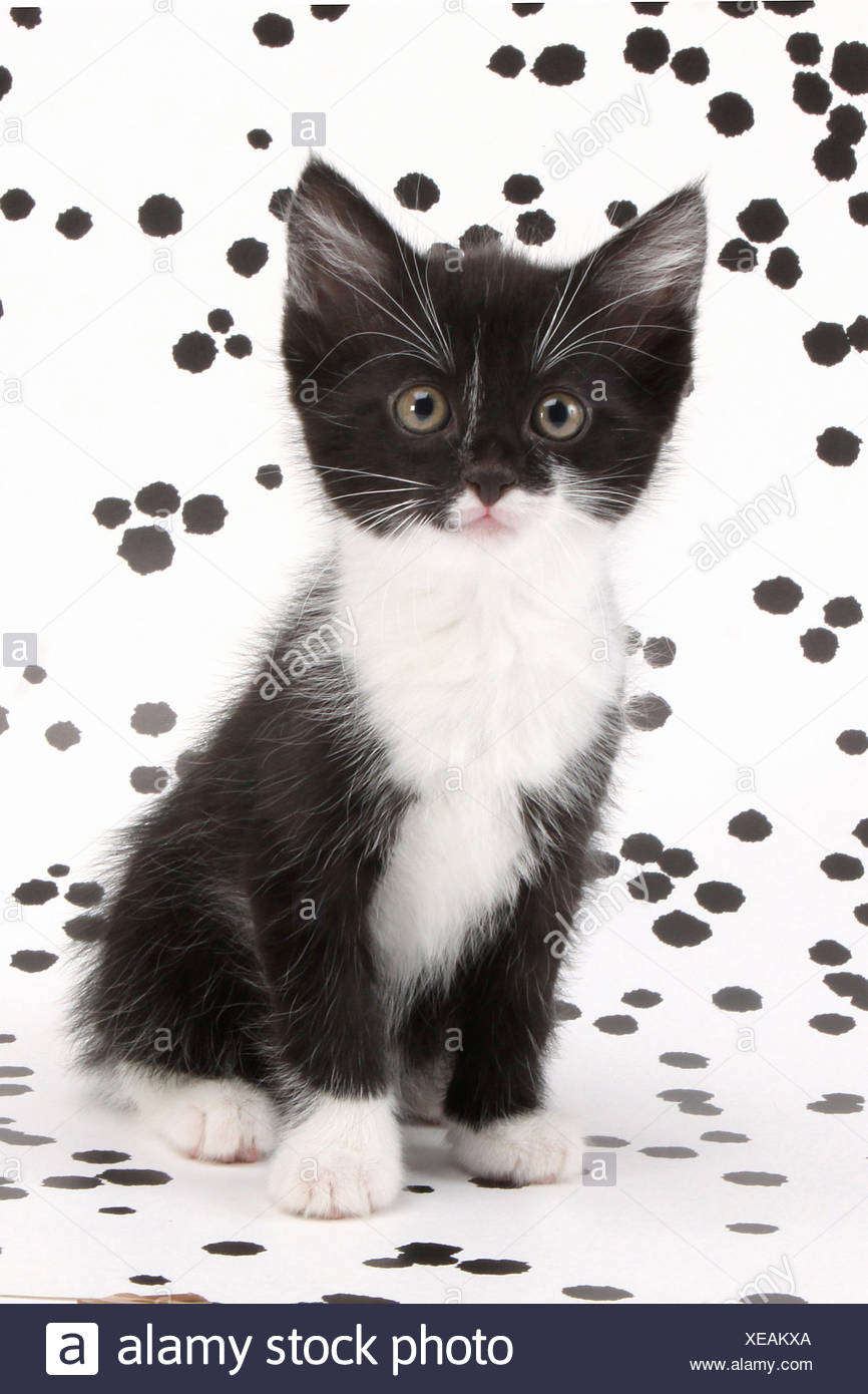 Domestic Cat Tuxedo Kitten Sitting In Front Of Spotted