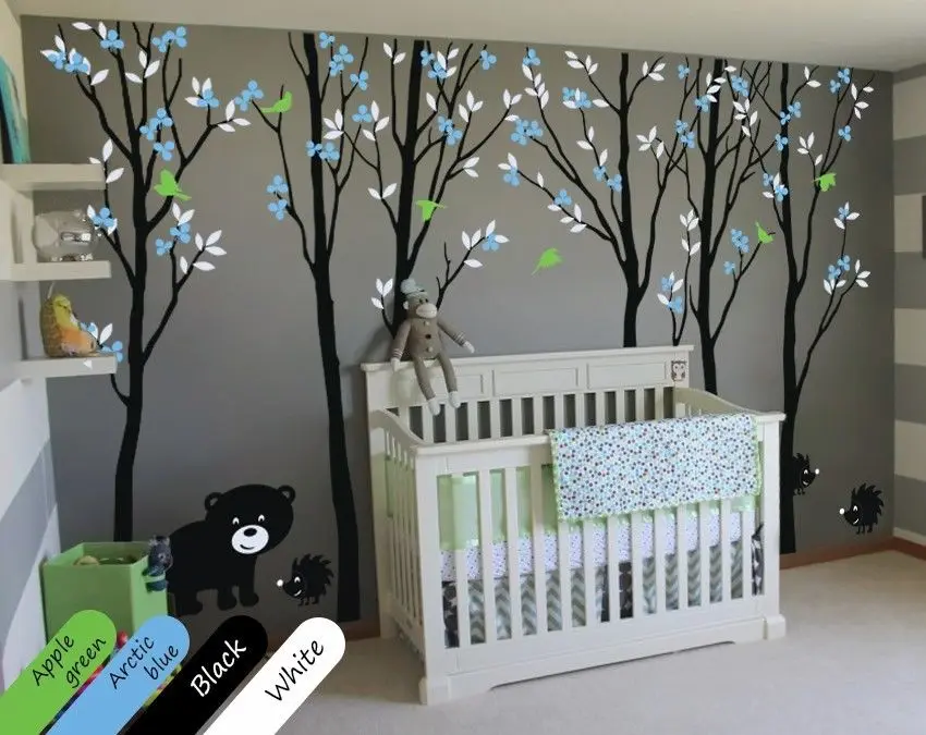 Large Black Tree Nursery Wall Design With Cute Birds And