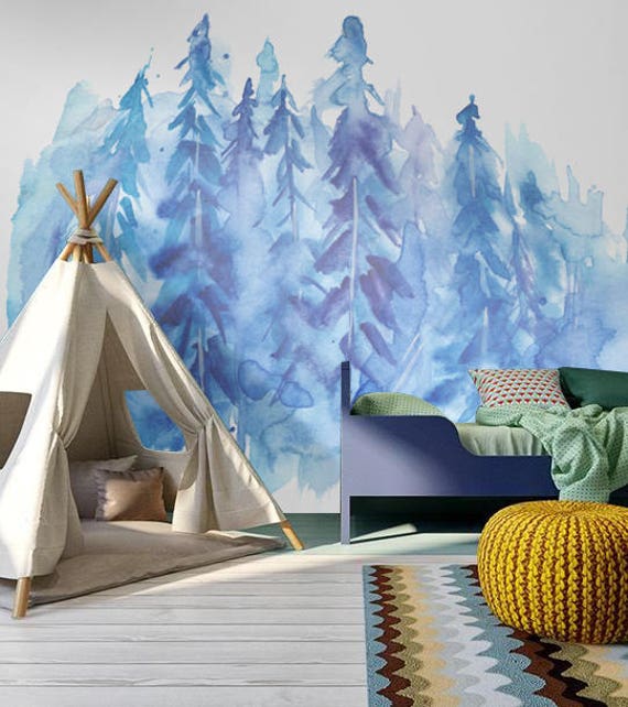 Winter Watercolor Forest Trees Wall Covering Removable Wallpaper Mural Wall Decal Easy Stick Self Adhesive Reusable 189